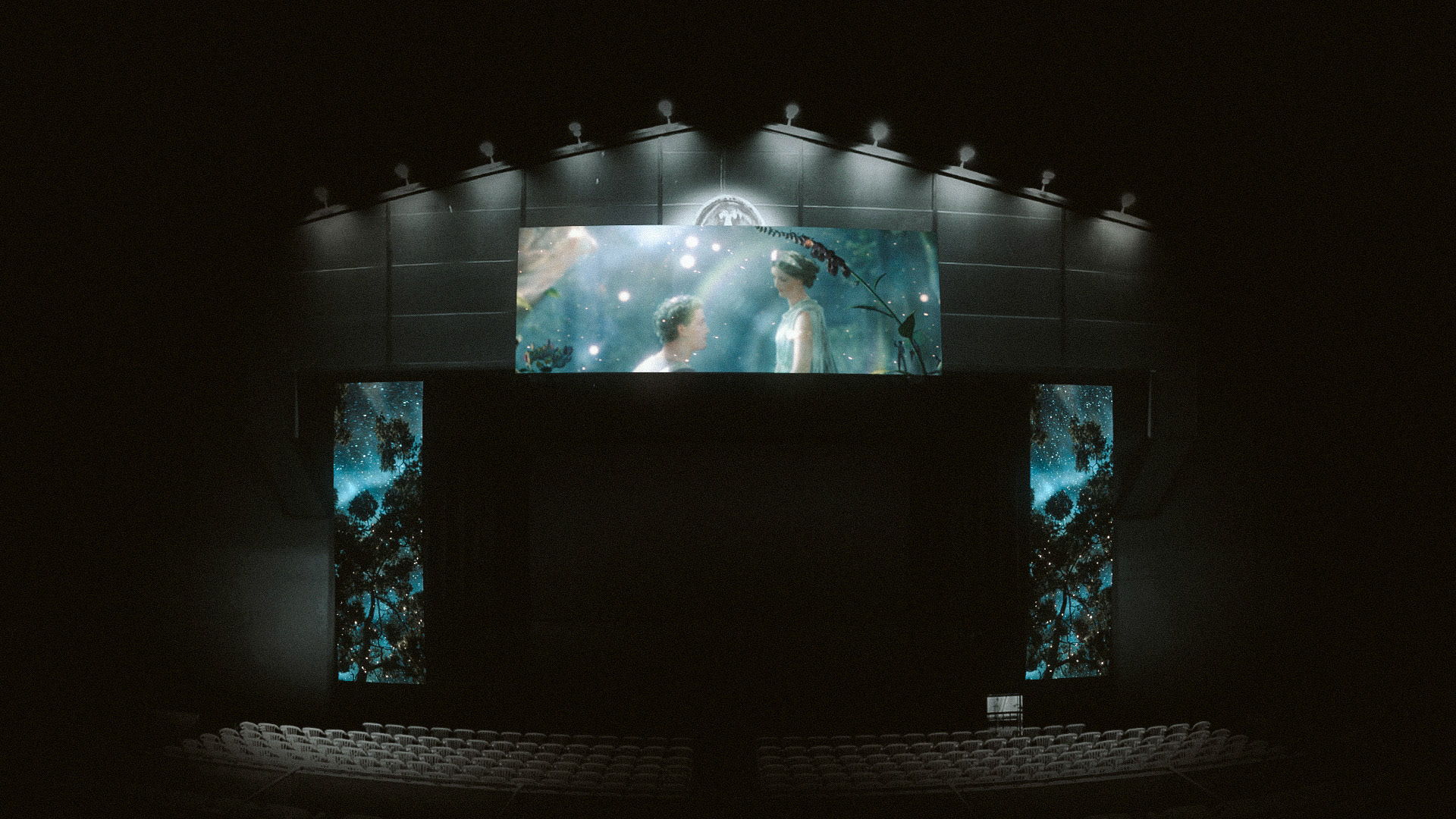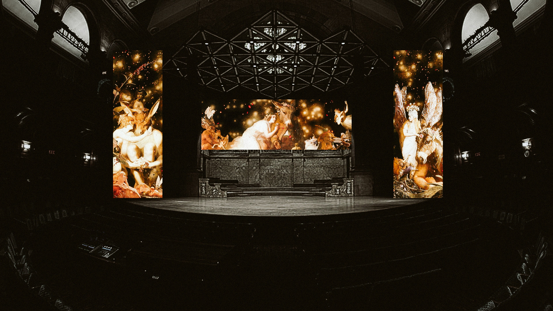 We wanted to transport the public to the fantastic world of the play, so we decided to create some atmospheric projections that could take advantage of each of the scenario's architecture. These projections represented the environments and emotions occurring during the story.